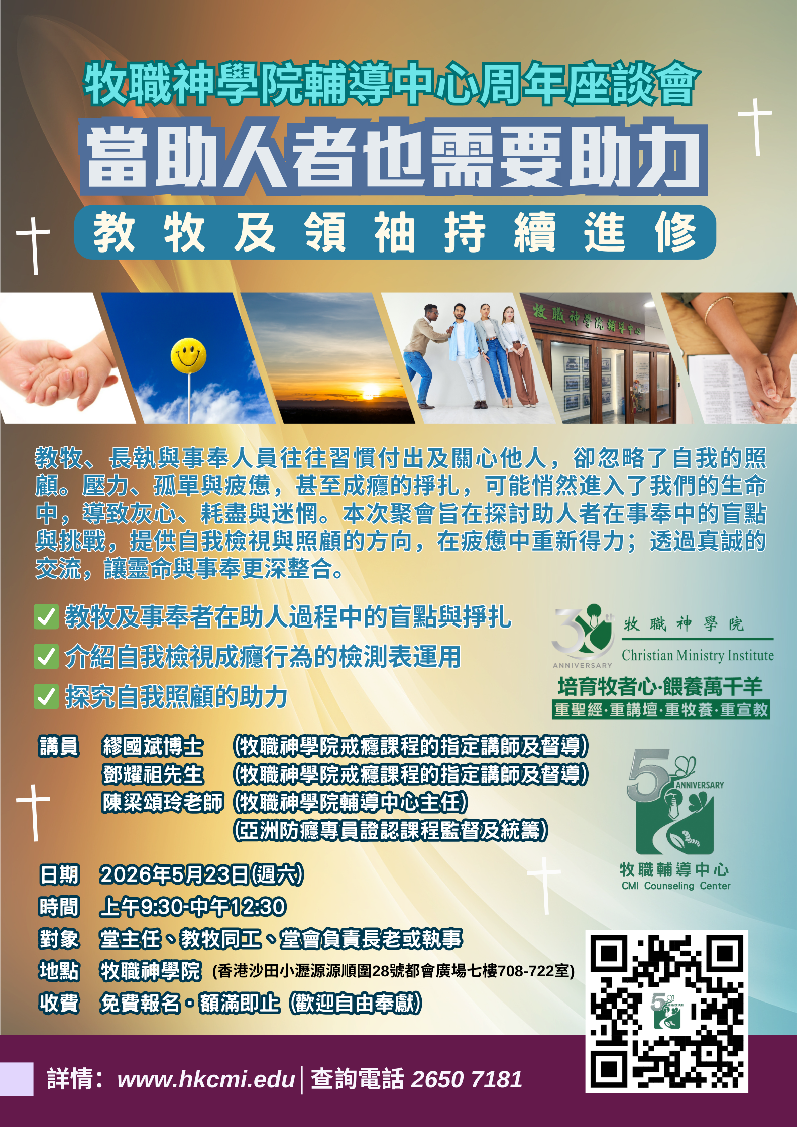 教牧、長執與事奉人員往往習慣付出及關心他人,卻忽略了自我的照顧。壓力、孤單與疲憊,甚至成癮的掙扎,可能悄然進入了我們的生命中,導致灰心、耗盡與迷惘。本次聚會旨在探討助人者在事奉中的盲點與挑戰,提供自我檢視與照顧的方向,在疲憊中重新得力;透過真誠的交流,讓靈命與事奉更深整合。