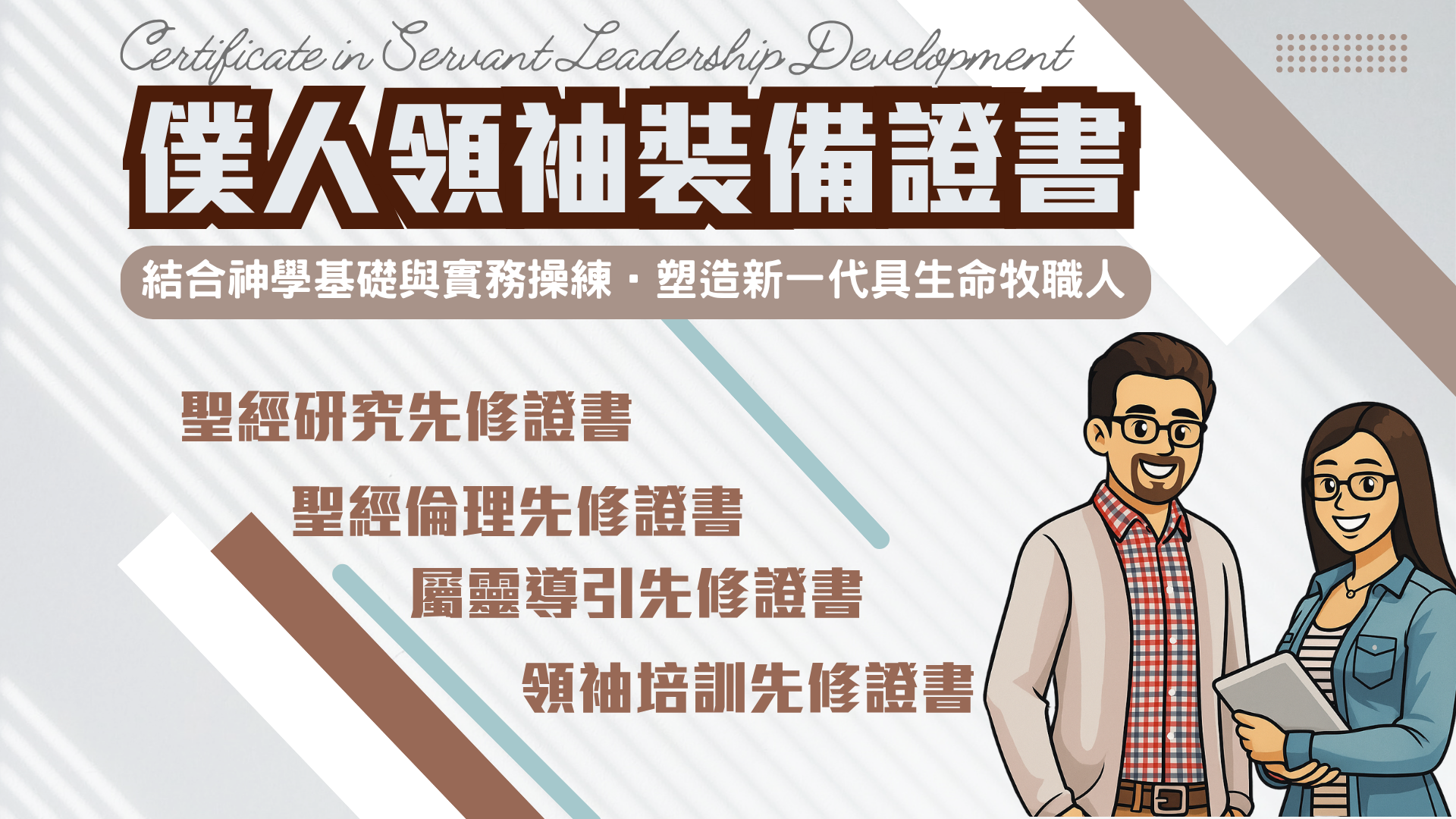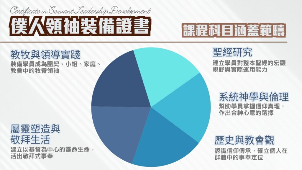 《僕人領袖裝備證書課程》是一套專為信徒領袖、福音幹事、小組教會牧者而設的基礎訓練課程,融合神學訓練的五大核心範疇,幫助學員在信仰知識、靈命成長與事奉實踐中均衡發展的起步,成為教會中具生命的屬靈同行者與帶領者。