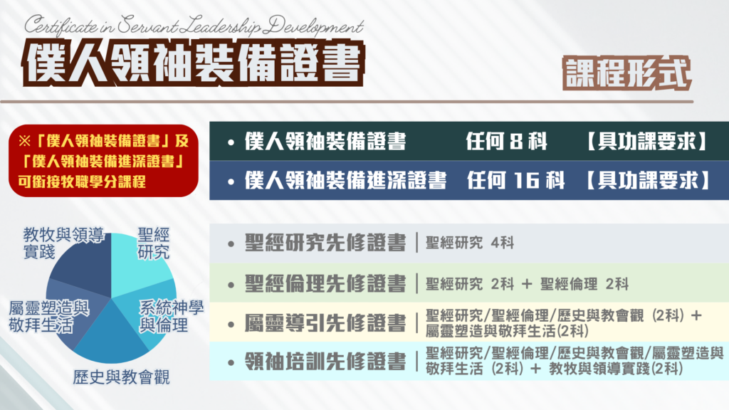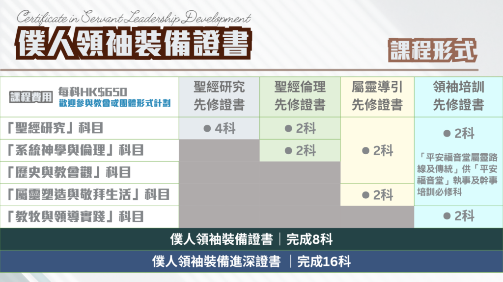 3. 4年內完成四科先修證書要求可申請相關先修證書;完成八科可申請「僕人領袖裝備證書」,再完成額外八科可申請「僕人領袖裝備進深證書」